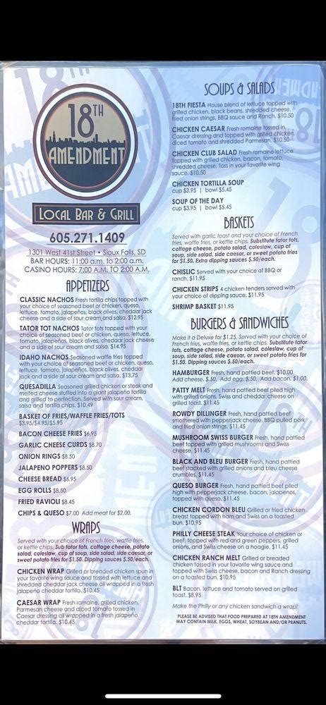 Restaurant menu, reviews and prices You are free to download the 18th amendment neighborhood bar menu files. My husband had a philly and i had a buffalo chicken wrap for $9.99! 7,147 likes · 13 talking about this · 24,448 were here. 1301 w 41st st, sioux falls. Web 18th amendment, sioux falls: Web sioux falls, south dakota33 contributions great lunch! By using this site you agree to zomato's use of cookies to give you a personalised experience. Web 18th amendment sioux falls, sioux falls; To our amazement, their special was a buy one get one free deal. Web classic italian fold over pick 3 of your favorite 18th amendment topping packed w/ 100% whole milk mozzarella & stone baked to perfection cheese 100% whole milk mozzarella, cheddar, parmesan, ricotta, feta cheese, goat cheese, provolone, gorgonzola, fontina, &.
