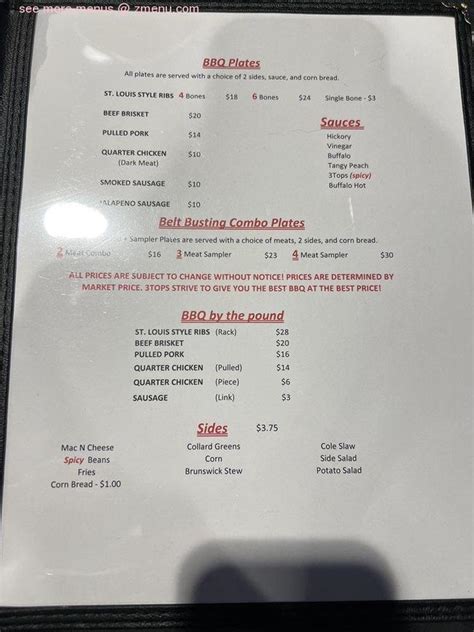 3 Tops Bbq Menu . Web 3 tops bbq 24 reviews claimed $$ barbeque edit see all 24 photos write a review add photo save menu popular dishes pulled pork sandwich 3 photos 4 reviews hickory 1 photo 5 reviews brunswick stew 2 photos 4 reviews smoked wings 1 photo 2 reviews ribs 1 photo 2 reviews location & hours 5796 ogeechee rd savannah, ga 31405 get. Drizzled with our signature tops sauce served with fries.