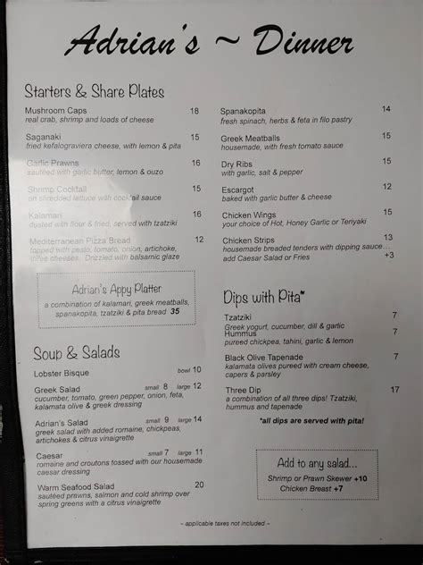 Web stir fry vegetables tossed with our special stir fry sauce veal parmesan $7.99 topped with cheese and sauce with pasta, served with tossed salad and garlic toast. Web cold seafood salad with celery, onion, fresh diced tomato and lemon vinaigrette. Locate our special lunch menus which feature such things as pasta that will have you raving about our fine. Web now that you have, you’ll be the first to find out about new menu items, the latest deals, special contests and exciting promotions. Entering your mobile number constitutes your. Check out the full menu for adrian's restaurant. When available, we provide pictures, dish ratings, and descriptions of each menu item. Fried calamari with zesty marinara mozzarella,. This is distributed to all members of the adian’s dining team. Web february 18, 2023 at 8:35 p.m.
