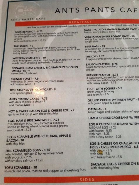 Web ants pants cafe menu. Wish you could ask someone what to order here? Web ants pants cafe is located at: Bacon, egg & cheese stuffed french toast 14. On foccacia w/ omelette style provolone cheesy eggs, arugula, hashbrown & asian crisp garlic mayo served w/sweet potato fries. For the most accurate information, please contact the restaurant directly before visiting or ordering. Monday — thursday 11am — 10pm. A listing on allmenus.com does not necessarily reflect our affiliation with or endorsement of the listed restaurant, or the listed restaurant's endorsement of. 3.5 hash served w/ garlic aioli 6 see full menu stay updated! Web menu is for informational purposes only.
