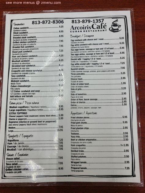 Web menu at arco iris cafe, tampa, n habana ave home / usa / tampa, florida / arco iris cafe, 4001 n habana ave / arco iris cafe menu arco iris cafe menu add to wishlist add to compare #219 of 3222 cafes in tampa proceed to the restaurant's website upload menu menu added by users september 30, 2022 menu added by the restaurant. Web arco iris cafe 4001 north habana avenue 23 ratings 88 food was good 100 delivery was on time 88 order was correct closed categories about reviews breakfast appetizers salads sandwiches rices beans spaghetti cuban pizza entrees dessert shakes drinks breakfast desayuno. Learn more closed reviews breakfast appetizers salads sandwiches rices beans spaghetti cuban pizza entrees dessert shakes drinks breakfast desayuno. Egg white sandwich with cheese and 1 meat $4.95 sandwich de huevo blanco. Best cuban food in the tampa bay area. Web menu view menu additional dining info delivery no payment credit cards accepted parking parking lot good for kids yes attire casual alcohol beer and wine reservations no price point $ wifi no outdoor seats no restaurant description is this your restaurant? 2,492 likes · 3 talking about this · 8,322 were here. Web arco iris cafe 4001 north habana avenue 23 ratings 88 food was good 100 delivery was on time 88 order was correct this restaurant is unaffiliated with grubhub. 2 eggs bacon and 1/2 of toast. In accordance with the visitors' opinions, waiters offer perfectly cooked bean soup, beefsteak and bean rice here.