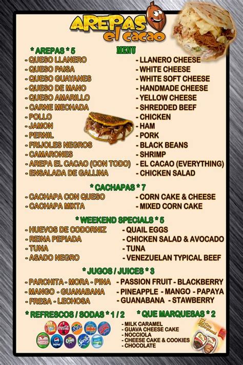 • ¢¢ • latin american • mexican • vegetarian • healthy Web arepas el cacao 57 reviews unclaimed $ venezuelan, fast food edit see all 53 photos write a review add photo share save menu popular dishes cachapa con jugo de parchita 2 photos 3 reviews chicken salad 2 photos 2 reviews cachapa de queso 1 photo 1 review chorizo 1 photo 2 reviews location & hours 4115 town center blvd ste b. Web the menu for arepas el cacao may have changed since the last user update. Sirved does not guarantee prices or the availability of menu items. Customers are free to download these images, but not use these digital files (watermarked by the sirved logo) for any commercial purpose, without prior written permission of sirved. Users love the crane mechada, which is one of the most popular items on the menu, as well as the canchapa con queso and the parchita, which are two of the items most commonly ordered together. Web menu menu for arepas el cacao arepas queso paisa (white cheese) $6.00 pernil (pork) $8.15 cachapas canchapa con queso (sweet corn with cheese) cafe / coffee cafe espresso (coffee espresso) cafe con leche (coffee latte) jugos / juice pina (pineapple) $3.00 guanabana (guanabana) $3.00 presa (strawberry) $3.00 refrescos / soda crush. Web menu arepas queso paisa (white cheese) $6.00 queso guayanes (white soft cheese) $8.15 pernil (pork) $8.15 jamon (ham) $6.00 frijoles negros (black beans) $6.00 queso llanero (llanero cheese) $6.00 ensalada de gallina (chicken salad) $8.14 camarones (shrimp) $6.00 cachapas canchapa con queso (sweet corn with cheese) $7.75 cafe /.