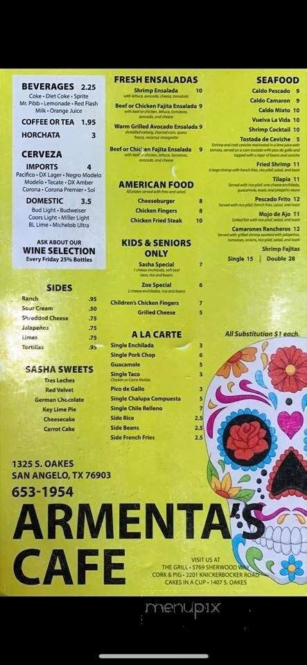 Web view the online menu of armentas cafe and other restaurants in san angelo, texas. Web armenta's cafe san angelo, san angelo; Grilled fish with rice pillof, salad and toast. Franco's is plain as a flour tortilla on the outside but, just like a. 1325 s oakes st, san angelo. Web order delivery or pickup from armenta's cafe in san angelo! Home banteay meanchey province krong poi pet krong poi pet, cambodia. View armenta's cafe's february 2023 deals and menus. 1325 s oakes st san angelo, tx 76903 uber. Support your local restaurants with grubhub!