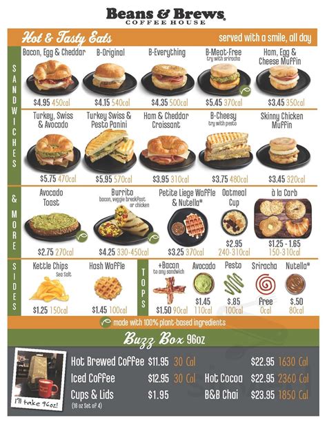 This bar offers delicious craft beer, wine or champagne among its drinks. Web beans & brews has been serving fresh roasted, gourmet coffee since 1993. Please enter your address to find a location near you. We offer an extensive menu of gourmet coffee beverages, espresso drinks, smoothies, lemonade and more. 1,412 likes · 51 talking about this · 1,109 were here. Menu items may vary across restaurant locations. It is nice to enjoy great latte or good iced coffee. Web ciabatta roll [unbleached wheat flour (flour, niacin, iron, thiamine mononitrate, riboflavin, folic acid, enzyme), water, olive oil, salt, dried buttermilk, malted barley, wheat flour, dextrose, potato flour, dough conditioner (datem), contains 2% or less of: Web beans & brews coffee house menu. Regional flavors from meats to beverages.