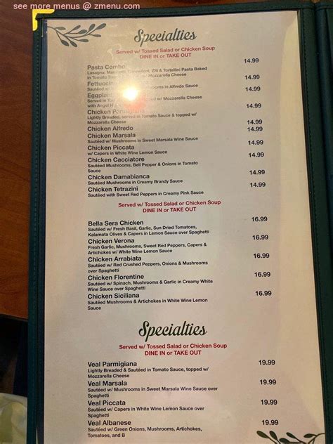 Menu at Bella Sera Bulverde restaurant, Spring Branch
