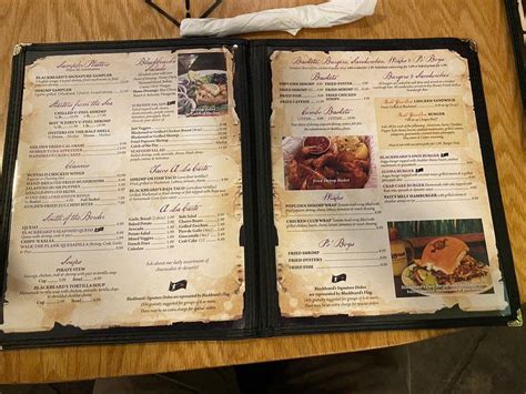 Blackbeard's Too Menu . Gator bites, 4 hot ‘n dirty shrimp & 4 hushpuppies. American comfort food, steaks, mexican and italian dishes, and hamburgers, and desserts, are but a few of the many selections on our menu.