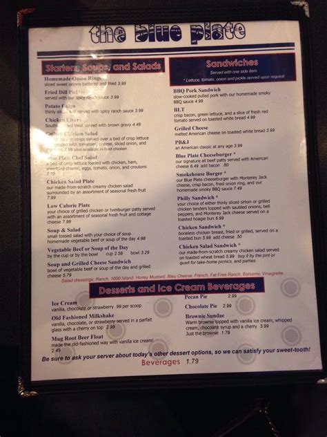 American, breakfast, brunch, comfort food. Web blue plate specials come with your choice of two side items. Web the blue plate menu main menu daily specials catering menu specials chicken tenders fried or grilled $7.99 chicken and dressing white or dark quarter with giblet gravy $7.99 roasted chicken white or dark $7.59 bbq chicken leg quarter smothered in our homemade smokey bbq sauce $7.59 marinated grilled chicken breast We offer a variety of menu items to complete any meal. Bbq chicken $7.59 quarter white breast with homemade bbq sauce. Web blue plate chef salad $9.99. Chicken tenders $7.99 fried or grilled. A bed of crisp lettuce loaded with chicken, ham, shredded cheese, eggs, tomato, onion, and croutons. When owner chris bradshaw and partner allen aldridge opened the first blue plate restaurant on november 9, 2004, they decided to offer a menu with a variety wide enough to satisfy any sized appetite, tastefully prepared in the. Pork ribeye $10.99 grilled salmon $11.99 fresh salmon grilled or blackened with dill sauce.