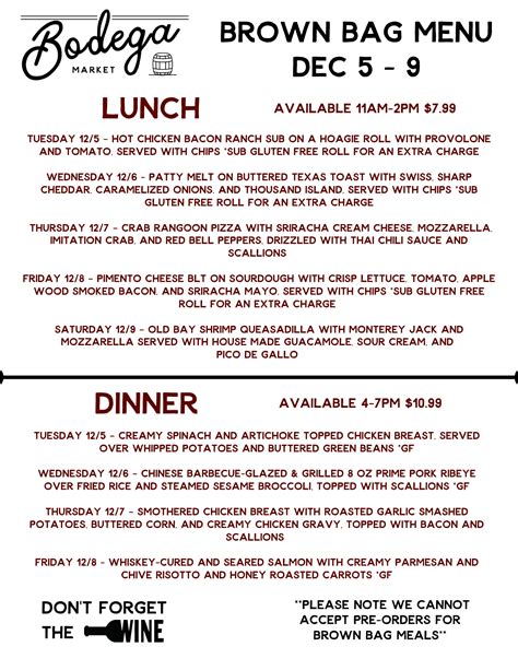 Looking for amazing wine options? Web brown bag menu we accept online orders for major holidays throughout the year including easter, mother's day, thanksgiving, and christmas. Our famous cinnamon rolls are available every weekend! Outside of the online order times, you can email us or message through facebook to place an order by 7pm each thursday. Web this week's brown bag lunch menu has so many yummies you might swoon! Food for elders program provides a free bag of healthy groceries to eligible seniors once a month at local senior centers and community organizations. Web bodega wine and specialty foods market, tipp city, ohio. Web sliced marinated flank steak. Caramelized onion, horseradish, provolone and steak sauce on a toasted ciabatta roll. Bodega wine and specialty foods market | tipp city oh