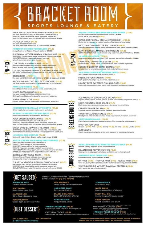 Web bracket room menu brunch brunch super skinny pizza $10.90 brunch breakfast paella $14.90 sunnyside eggs, peppers, avocado, heirloom tomoto and rice. Web view the online menu of bracket room and other restaurants in arlington, virginia. View the online menu of bracket room and other restaurants in arlington, virginia. Web bracket room is an upscale sports bar and restaurant in the heart of arlington. Order delicious mimosas, white russianor whiskey sour. Web it's worth coming to this bar for tasty caramel cheesecakes, triple chocolate cakesand baked apples. Web bracket room 1210 n garfield st not available on grubhub anymore find something that will satisfy your cravings explore options already have an account?