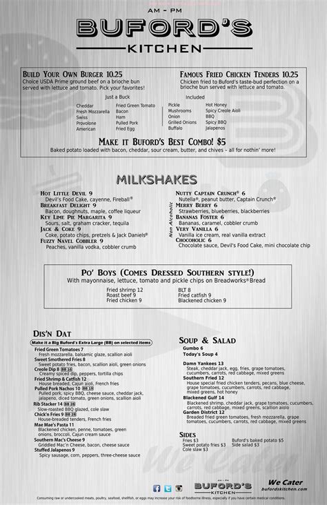 You are free to download the buford's kitchen menu files. F.g.t grilled cheese $11.90 american, pimento cheese, fried green tomato, scallion aioli. Pickle, mushrooms, onion, grilled onions, buffalo, hot honey, spicy creole aioli, bbq, spicy bbq, jalapenos. Make it buford's best combo! Web menu added by the restaurant owneroctober 13, 2021 the restaurant information including the buford's kitchen menu items and prices may have been modified since the last website update. Web roasted turkey, tomato, field greens, bacon, jalapenos, caramelized onions, cheddar, chipotle aioli. Web fried, mashed potatoes, corn sauté, bell peppers, white wine garlic sauce jambalaya $19.00 andouille, shrimp, chicken, tomatoes, peppers, onions, cajun seasoning, and rice. Brisket $14.00 brisket, caramelized onions, cheddar, onion straws, barbeque. Strawberry shortcake shake $6.00 strawberry syrup, cake, and fresh strawberry garnish. Discover our american food such as soup.