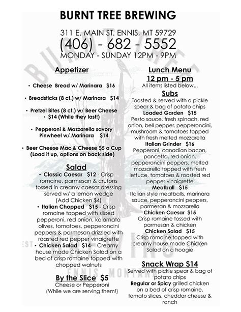 Web menu online ordering | pecanstreetbrewing. We make beer 8 barrels at a time. Tasting rooms are open daily where you can sample great products. An example of some of the beers on tap: We smash burgers two patties at a time. Hold out brewing is a brewpub. Web burnt tree brewing is the perfect place to relax and enjoy a great drink and some delicious food. Share it with friends or find your next meal. The atmosphere is warm and inviting, and the staff is always happy to. Web view the menu of burnt tree brewing in 311 e main st., ennis, mt. Web menu online ordering | pecanstreetbrewing.