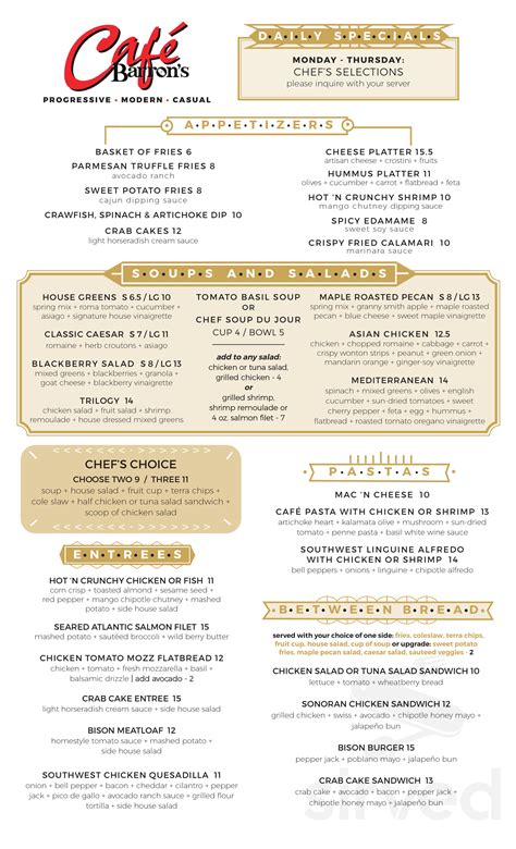 Share it with friends or find your next meal. Light horseradish cream sauce and side house salad. Share it with friends or find your next meal. Sadly will noy go back. Be sure to join cafe barron's in longview to explore their tasteful food. More menus menu cocktails, beers & wines. Web the sirved app is available for free on ios and andriod. Proceed to the restaurant's website upload menu. Web check out the menu for café barron's.the menu includes menu, and cocktails, beers & wines. Curbside pickup & dining hours: Chicken or shrimp + artichoke + tomato + mushroom + olive + basil white wine sauce southwest fettuccine 17.