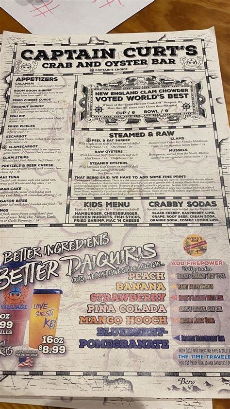 Seafood, bars, american (traditional) 0.07 mi away. Mix of iceburg and romaine lettuce, with red cabbage, onions, carrots, tomatoes and cucumbers add chicken to dinner salad for an additional $3.00 add shrimp to dinner salad for an additional $4.00 add mahi to dinner salad for an additional $4.00 add tilapia to dinner salad for an additional $4.00 add grouper to dinner salad for. Corn fritters $5.99 it ain't easy breading cream corn, but we did it. Friendseat members have given the restaurant a rating 5 out 10 based on 20 total reviews. Ribs and shrimp $17.99 baskets all baskets served with french fries & cole slaw. Web siesta key restaurant menu. Admiral's platter $16.99 fried white fish, scallops, shrimp and devil crabs. And shrimp broiled or fried. This means this restaurant needs more positive reviews. Web captain curt's crab & oyster bar menu appetizers fish dip $8.99 smoked mahi, amberjack and marlin served with a fresh bread stick. Web captain curts crab & oyster bar.