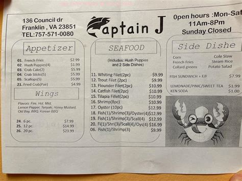 A) fish, shrimp, scallop & crab cake $10.95 dinners includes fries, hushpuppies and cole slaw. Web captain j's in cocoa beach, fl. Menu menu for captain j seafood appetizers scallops. $6.49 tilapia $6.49 chicken include fried, hushpuppies and cole slaw. Fish & chicken $8.49 chicken tenders $8.49 steamed shrimp shells on. We offer a variety of grain foods, dairy products, vegetables, produce, fresh seafood, fresh shrimp, and fresh poultry in our markets. With you buy, we fry®, we are distinguished from other institutions deemed as fast food. Large shrimp $11.99 28 pcs. Web captain jay’s fish & chicken is dedicated to bringing local neighborhoods the freshest fish and chicken in the market. Check out our location and hours, and latest menu with photos and reviews.