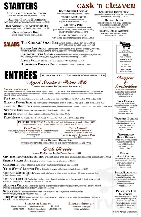 Web kids menu a special selction of kid's 10 and under $5.95. Web cask 'n cleaver steakhouse dinner menu menu for cask 'n cleaver steakhouse lunch menu dinner menu wine list starters six spice steamed artichoke with drawn butter and mayonnaise $10.95 sauted button mushrooms with garlic, white wine and parmesan cheese $9.95 hot spinach and artichoke dip served au gratin with tortilla chips and salsa Charbroiled chicken breast, avocado, bleu cheese, bacon, tomato and egg tossed with ranch dressing. Web ©2022 by cask & cleaver. We've been committed to our reputation for great steaks and friendly service since we opened our first restaurant in an old california ranch house in the vineyards of cucamonga in 1967. Web iceberg lettuce, black beans, corn, cilantro, carrots, tomato, scallions, tossed with buttermilk ranch and bbq sauce, topped with crispy tortilla strips and charbroiled chicken breast. All items are paired with a wine, labeled on the menu by bin number, as suggested by the winemaker. Web menus | clyde's american bar & restaurant. Clyde's serves a diverse menu including fresh seafood, steaks, sandwiches, greens, and pasta. Explore menu, see photos and read 982 reviews: