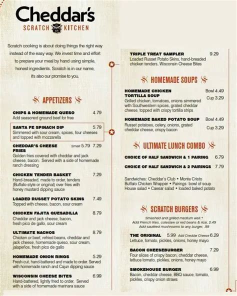 Chicken tender platter order now country fried steak order now honey butter croissants order now grilled salmon order now country fried chicken order now santa fe spinach dip order now homemade chicken pot pie order now You are the first person guests see when they walk in the door; Web dive into a new experience with american food and allow cheddar's scratch kitchen to bring you something mouthwatering, including delicious seafood. We have options for every member of the family to explore! Combo meals are inexpensive and yummy. Web cheddar's scratch kitchen. Hosts also ensure guest touch points are clean and sanitized; That means making great drinks time and time again, serving them up with a friendly smile and by sanitizing guest touch points for safety. Information shown may not reflect recent changes. Enjoy your favorites at home with curbside pickup. A listing on allmenus.com does not necessarily reflect our affiliation with or endorsement of the listed restaurant, or the listed restaurant's.