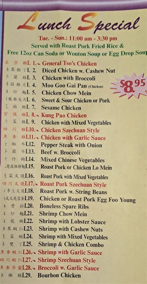 Chicken with broccoli $4.65 l1. Diced chicken with cashew nuts $4.65 l7. Web menu info & hours all day menu lunch menu special chinese american dishes 炸鸡翅fried chicken wings (4) $5.55+ 炸小虾fried shrimps $5.55+ 炸干贝fried scallops $5.55+ 炸薯条french fries $3.99 炸面包french sweet doughnuts $3.99 appetizers 1. The portions are very generous. Web deep fried with sweet and spicy sauce. Web this restaurant is a right choice if you are in the mood for the chinese cuisine. Proceed to the restaurant's websiteupload menu. Chicken that has been marinated in a bourbon sauce. Sweet & sour chicken $4.65 l2. Web i ordered a few things :