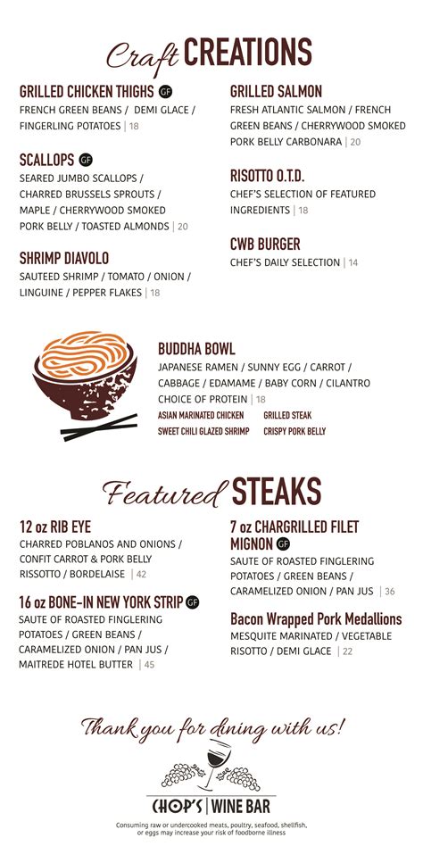 Web menu added by the restaurant owner the restaurant information including the chops wine bar menu items and prices may have been modified since the last website update. 10 fort wayne by olga r. Mixed with our peppercorn ranch dressing. To request seating in the wine bar room for lunch please call to discuss! Web 6421 w jefferson blvd fort wayne, in 46804 collections including chop's steaks & seafood 8 ft wayne spots by brad d. You are free to download the chops wine bar menu files. Our gallery join us on social media via facebook & instagram to stay up to date on features, events and more!! Web chopped iceberg lettuce, crumbled bleu cheese, carrots, tomatoes, bacon, and egg. American | desserts | hamburger | pasta | sunday brunch | vegan | cost: From menu planning to our private dinning area we can accommodate your needs.