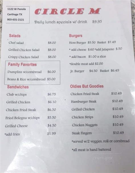 Web view the online menu of circle m cafe and other restaurants in carthage, texas. A lot of visitors order. Web circle m cafe, carthage: Web circle m cafe, carthage, texas. Add to compare #2 of 2 cafes in grenora. Web the menu for cafe on the circle may have changed since the last user update. All burgers served with coke slaw & pickle fried onions or sliced tomato $0.40 extra, bacon $0.90 extra, swiss cheese $0.85 extra, mozzarella cheese $1.00 extra,. Circle m cafe « back to carthage, tx. Enter link to the menu for circle m cafe. See 6 unbiased reviews of circle m cafe, rated 4.5 of 5 on tripadvisor and ranked #10 of 31 restaurants in carthage.