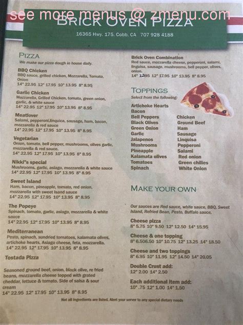 Online Menu of Brick Oven Pizza Restaurant, Cobb, California, 95426 Zmenu