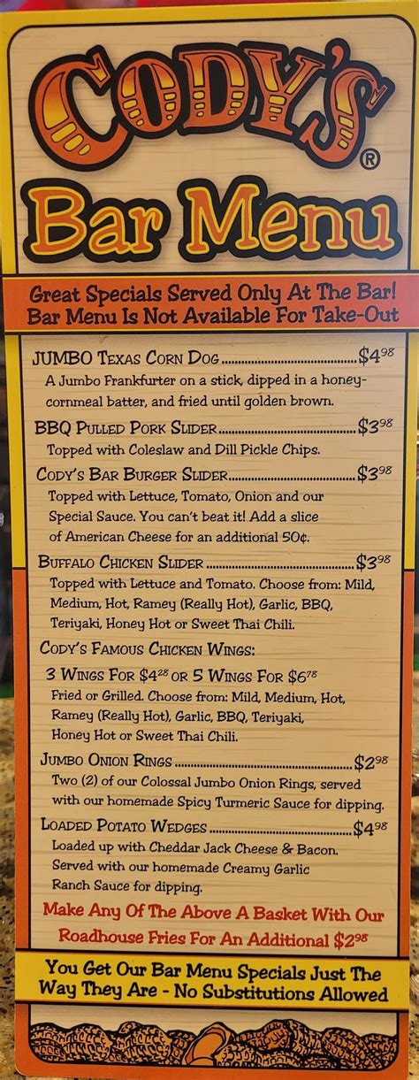 Cody's buffalo wings $6.99 a big portion of large wings done cody's way. Cody's top sirloin chop salad $14.48 fresh crisp greens, chopped and mixed with tomatoes, red onions, cukes, diced red and green peppers, roasted corn and black beans, and tossed in our balsamic vinaigrette. Served with our balsamic vinaigrette dressing. Served on a stick with spicy turmeric dip. We opted for the half chicken entree and the blackened boneless pork chops. Served over texas toast with coleslaw. Web tubs of roasted peanuts are available throughout for crackin n’ snackin’. Servings were large and would easily serve two average. Web a good variety of menu offerings. $9.98 *country sunrise burger topped with american cheese, crispy bacon, onion straws and a. All was fresh and satisfying.