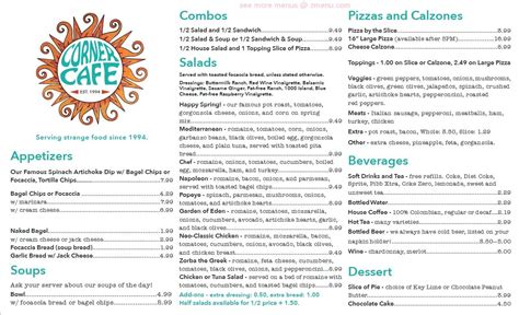 Web menu | the corner cafe | menu some of our favorite family recipes have been turned into our daily specials that we make fresh each day. Corner cut $6.49 cream cheese, pepperoni, onions, monterey jack, tomato, baked then topped with sprouts and vinaigrette. Immaculate paintings covered the store with some works from uwg students. Sandwiches, pizza and salads but like you will find no place else! I forgot to take pictures this trip so i will return to get some pictures to post. Web menu for corner cafe appetizers. Bookmark update menu edit info read reviews write review. The spinach artichoke dip was great. Web view the menu of corner cafe in 304 adamson sq, carrollton, ga. The staff was very friendly.