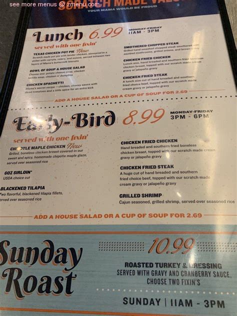 Place orders online or on your mobile phone. I ordered the chicken fried steak. For current price and menu information, please contact the restaurant directly. Information shown on the website may not cover recent changes. Freshly baked rolls & butter. They offer tenders, soups, quesadillas, chicken fried brisket, sandwiches, tacos, family meals, steaks, appetizers, chicken, pasta, vegetable platter,. This was my first time eating at this establishment. The mashed potatoes and fried okra were also very nice. The banana pudding for dessert was nice but the portion was very small. Garden salad with choice of dressings or house caesar salad.