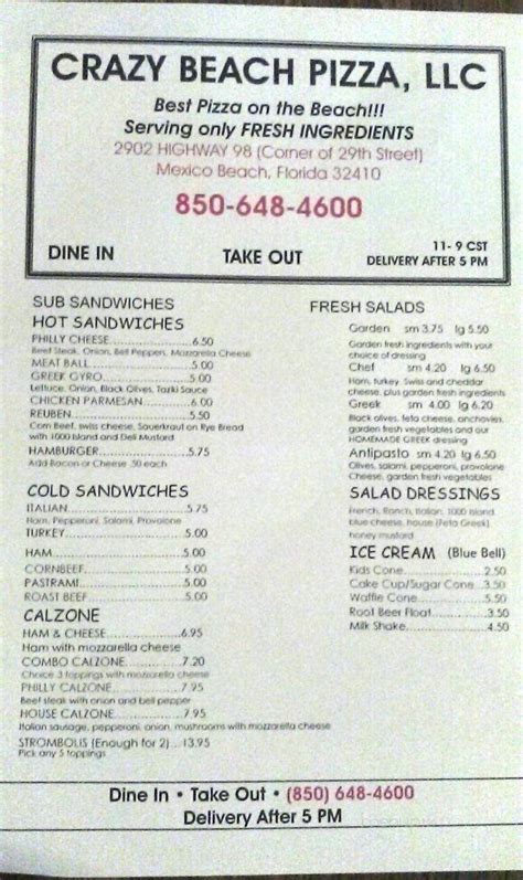 Web crazy beach pizza, llc menu. Create your own pasta (homemade meatballs) ★ 5. ∼ greek pita sandwiches & parmigiana heroes; Customers are free to download these images, but not use these digital files (watermarked by the sirved logo) for any commercial purpose, without prior written permission of sirved. Web crazy beach pizza fast food restaurant send message hi! Web crazy beach pizza, mexico beach, florida. Full review restaurant menu frequently mentioned in reviews pizza meat cheese chicken ham calzone pizza pepperoni mexican pizza burgers pork see all ratings of crazy beach pizza, llc yelp 62 foursquare 5.7 / 10 18 google. #1 of 1 pizza restaurantin mexico beach. Web this place is famous for its pretty atmosphere. The restaurant information including the crazy.