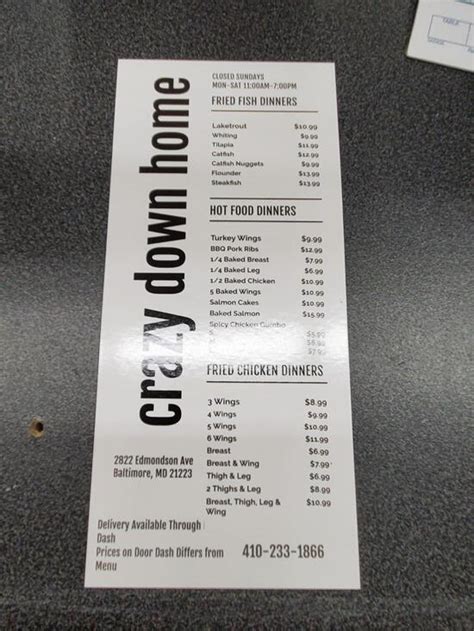 Imagine a place where traditional japanese culture is fused with the new modern era of cuisine. Web menu view menu additional dining info delivery no payment credit cards accepted parking good for kids no attire casual alcohol no reservations no price point $$ wifi. Web up to $3 cash back served with vegetables and home made sauce. Now let’s check out crazy down home chicken & seafood's menu! You will find that the menu is divided into the. Web regular hours crazy down home chicken and seafood 2542 w franklin st, baltimore if you're craving some home cooking food in baltimore, then you've come to the right. We're serving fresh made to order food. Web crazy down home, 2542 w franklin st / crazy down home menu crazy down home menu add to wishlist add to compare proceed to the restaurant's website. Web crazy down home chicken & seafood menu categories. Web storefront jsp index page