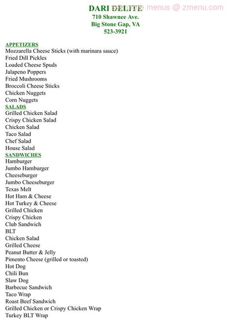 Dari Delite Big Stone Gap Menu. There is a nice little patio to sit outside and the staff. Not a chain and everyone receives a smile from the staff.