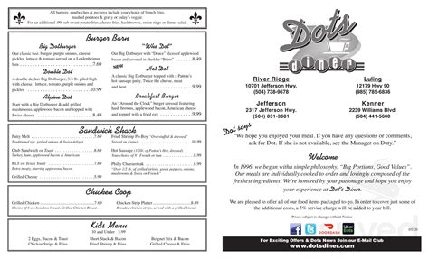 2 eggs, 2 strips of bacon, 2 sausage patties, 2 pancakes, hash browns, grits & toast. I created dots diner in 1996 to blend my. They have made to order breakfast, burgers and daily lunch specials, and meals for dinner. Web dots diner daily lunch specials daily lunch specials (click on menu to see full size) 2239 williams blvd, kenner la 2317 jefferson hwy, jefferson, la 10701 jefferson hwy, river ridge, la 12719 hwy 90, luling, la We have 24 hour restaurants in new orleans, metairie, river ridge, jefferson, kenner & luling. Best breakfast combos big breakfast platters breakfast sandwiches fantastic 3 egg omelets grilled hash browns & sides pancakes starters & salads sandwiches & burgers burger barn chicken coop sandwich shack around the clock:. Menu items and prices are subject to change without prior notice. Later, my first job had me on the road, i always felt most at home when visiting diners. Web dots diner 24 hour restaurant menu specials around the clock: Served with hash browns & toast. 3 eggs and 3 strips of bacon.