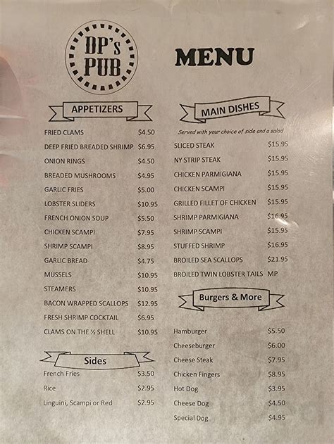 Dp's Pub Menu . Garlic fries, french onion soup, sliced steak sandwich are off. Contact us to connect with your.
