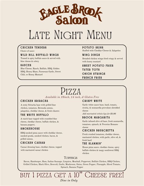 Eagle Brook Saloon Menu . It's a place where the locals go for beer, good food and to meet up with friends. Sirved does not guarantee prices or the availability of menu items.