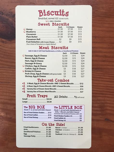 Edie's Biscuits Menu. 15 loudoun st se, leesburg, va 20175 703.687.7699. In fact the last time i had one was when they were next door where bread n circus is now.
