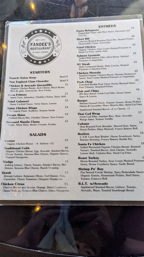 Fandee's Restaurant Menu . Steakhouse fare across our menus. Web at fandee's, we focus on working with sonoma county's finest, fresh, local ingredients to make family friendly food.
