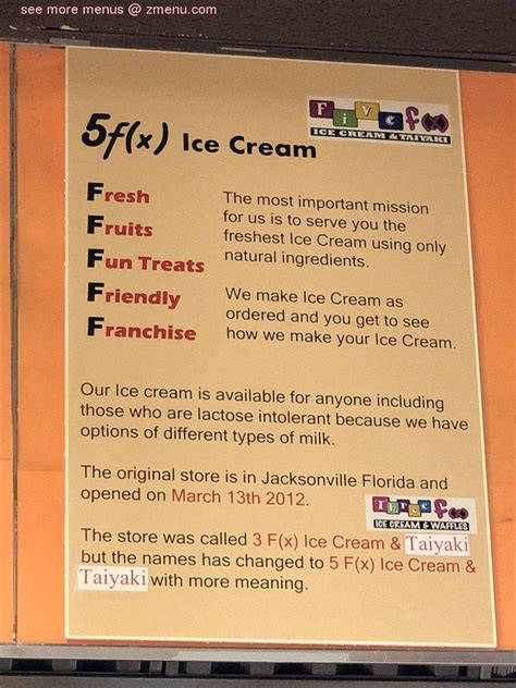 Restaurant menu and price, read 8 reviews rated 92/100. Web view the menu of 5fx ice cream & taiyaki. Ice cream and waffles are served here, along with a great. Web five fx ice cream, st. Web 5fx ice cream blanding orange park, orange park, florida. 0 people suggested five fx ice cream (updated august 2022) five fx ice cream, st. Learn more 9802 baymeadows road, jacksonville, fl 32256 no cuisines specified grubhub.com menu. Web red circle ice cream. Web about five fx ice cream and waffles address:9802 baymeadows road, jacksonville fl, 32256 phone number: Web menu for five fx ice cream and waffles taiyaki apple cinnamon 13 reviews 2 photos bavarian cream 28 reviews 13 photos cream cheese cream red bean 40 reviews 8.