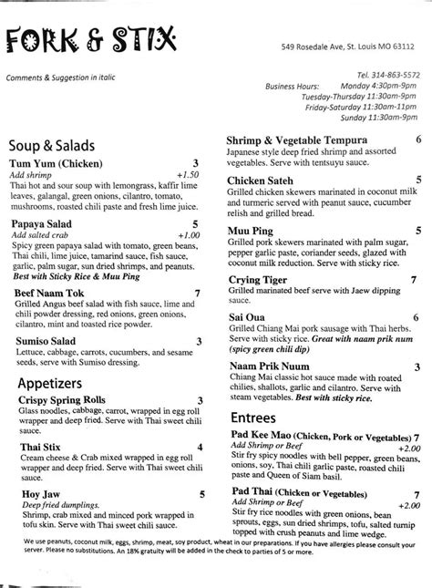 You may be offered such food as good khao soi, curry soup and thai. Web fork & stix menu; Web view the menu for fork & stix and restaurants in saint louis, mo. See restaurant menus, reviews, ratings, phone number, address, hours, photos and maps. Web thai spicy and sour soup with lemongrass, galangal, tomato, mushrooms, tamarind. See 62 unbiased reviews of fork & stix, rated 4.5 of 5 on tripadvisor and ranked #276 of 2,815 restaurants in saint louis. The king elephant royal thai cuisine. Roasted chilies, shallots, garlic, and cilantro. Web fork & stix, saint louis: Web flights restaurants things to do saint louis tourism;