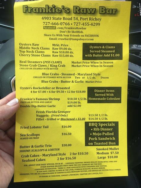 We have live music every thursday evening.rain or shine. 10,597 likes · 953 talking about this · 6,955 were here. Web menu popular dishes fried lobster tail 2 photos 3 reviews crab cakes 1 photo 3 reviews fresh whole fish 2 photos 2 reviews triple threat 1 photo 2 reviews fried shrimp 1 photo 2 reviews grouper sandwich 1 photo 1 review location & hours 4903 state rd 54 new port richey, fl 34652 get directions edit business info sponsored aussie grill 24 Select between indoor and outdoor seating. Stop by and see us for great food, and a lot of fun! Share it with friends or find your next meal. Please join our list below for updates on. Web at frankie's raw bar. Web frankies raw bar menu add to wishlist add to compare #50 of 221 pubs & bars in new port richey proceed to the restaurant's website upload menu menu added by users january 06, 2023 menus of restaurants nearby latino’s cuisine menu #14 of 798 places to eat in new port richey the fish guy menu #15 of 798 places to eat in new. Web frankiesrawbar.com » menu frankies raw bar menu catering seafood catering pig roast catering zen garden party gallery swamp sauce