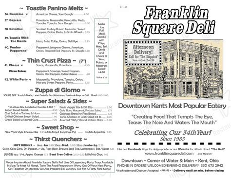 (lettuce, tomato, onion, italian seasoning, olive oil & wine vinegar) wednesday: Web up to 4% cash back franklin square deli, kent: Ad $15 off your first order of $20 or more. Web homemade roast beef and cheddar wrapped in a flour tortilla with shredded lettuce, vine ripened tomatoes, and horseradish mayo. Web menu is for informational purposes only. Use the uber eats app for dinner tonight See 75 unbiased reviews of franklin square deli, rated 4.5 of 5 on tripadvisor and ranked #4 of 118 restaurants in kent. From national restaurants to local mom & pops, doordash® delivers the top restaurants. In one bite, you taste our italian heritage and the party spirit of new orleans! Menu items and prices are subject to change without prior notice.