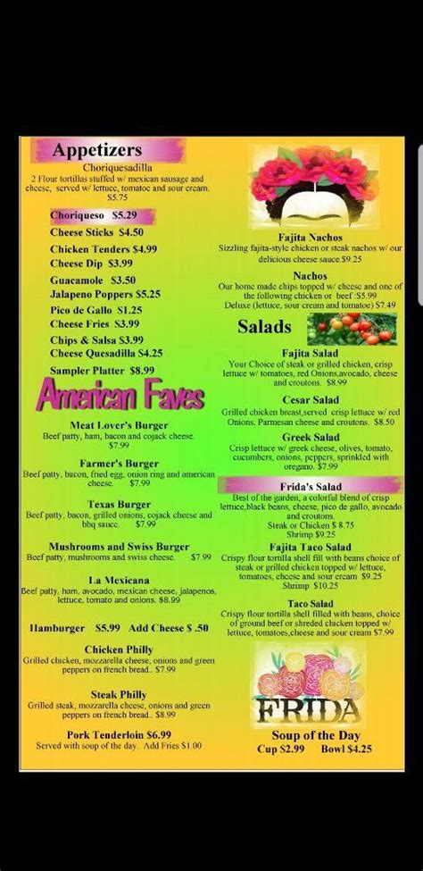 Web out of date menu; See restaurant menus, reviews, ratings, phone number, address, hours, photos and. Share it with friends or find your next meal. Our fully licensed bar menu provides the perfect. Cheese, topped with choice of chicken salad or avocado chicken salad, served. Bring your friends to frida. Updated more than 6 months ago. Our tacos, guac, fajitas and enchiladas are a testament to the best mexican restaurant in los. Busted her butt when it got busy! Download our menu or view it below.