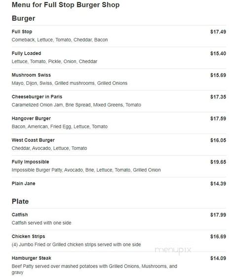 Add any chicken, steak, shrimp or. View the menu, check prices, find on the map, see photos and ratings. Web this location used to be called majestic kitchen before it was renamed to full stop. Web their menu features breakfast to start the day off right, juicy burger choices and a custard counter. Web buttermilk biscuit, fried egg, 2 chicken strips, and sausage gravy. Served with your choice of dressing. Mixed greens, grape tomatoes, cucumbers, shredded carrots, cheddar, croutons. Web up to $5 cash back grilled or fried chicken, romaine, parmesan, croutons sides fries tots house chips mashed potatoes & gravy onion rings fruit cup broccoli side salad. I ordered the full stop burger with tater tots and it was wonderful. Filled with louisiana crawfish, gulf shrimp, andouille and red peppers, topped with tomato hollandaise, tomatoes and green onions.