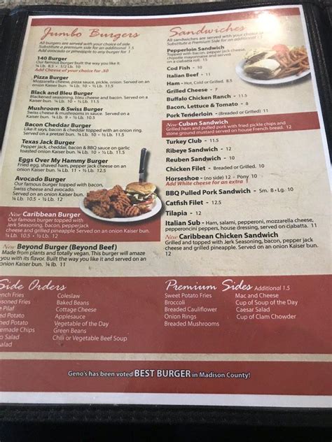 Geno's 140 Menu . Prices are reasonable, the food is great and plentiful, the faculty is very friendly. Great for the whole family.