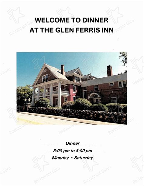 Web main menu comes with home made rolls and 2 sides swiss mushrooms pork loin pork loin chops, grilled, topped with sauteed mushrooms and covered in a swiss cheese sauce pork chops boneless, grilled center cut chops plain or barbeque ground sirloin ground steak, grilled and served with mushrooms gravy anniversary chicken Web 34 reviews of glen ferris inn new managment in 2012, and dramatic improvements. A few cabinet knobs still missing, but nice. New carpet, overall update of facilities: New chef, and both dinner and breakfast were excellent and reasonably priced. Copyright 2021, glen ferris inn, powered by fernwood creek Web book your event today! Web the glen ferris inn menu main menu appetizers shrimp cocktail shrimp served with tangy cocktail sauce $6.25 fried mozzarella sticks cheese sticks served with marinara sauce $4.99 smokin hot wings spicy chicken wings served with sauce $5.50 fiery hot peppers jalapenos peppers stuffed with cheese then battered and deep fried $4.50 soups