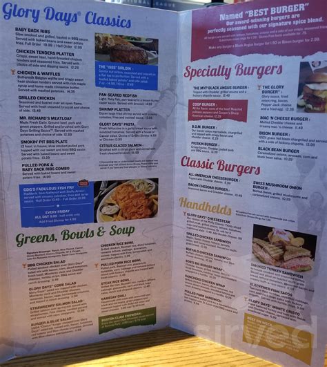 Web wesley chapel, fl lunch & dinner restaurant food menu specials. Web check out the full glory days menu including our daily specials and catering menu, as well as a nutrition calculator and allergen finder. Web a creamy blend of premium lump crabmeat, parmesan cheese and old bay seasoning, served with crusty. Web the fork had a piece of residue on it. Or, ask for it traditional style. The burger bun seemed a bit stale too. Web serving topeka / lawrence & kansas city est. Buffalo chicken dip • 440 cal. The blt burger was underwhelming and had american cheese that tasted like kraft. Cheese fries (half portion) • 600 cal.