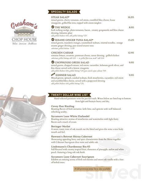 Gresham's Chop House Menu. 5,089 likes · 64 talking about this · 9,976 were here. Before placing your order, please inform your server if anyone in your party has a food allergy.