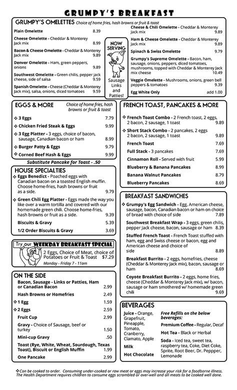Served with your choice of grits or home fries or hash browns. G's breakfast tacos served with lettuce & tomatoes. Blend of ham, tomato, onions, peppers, corn tortillas and egg. 2 eggs, 2 pancakes, bacon or sausage patties or sausage links. Web migas (made the grumpy way) 10.99. Greek gyros, philly cheesesteak, spaghetti, gourmet burgers, desserts &. Topped with ranchero sauce and mixed cheese. 4,951 likes · 162 talking about this · 449 were here. Web grumpy's big breakfast. Potato & egg $2.78 bean & cheese $1.55 sausage, egg & potato $2.79 bacon, egg & potato $2.79 barbacoa $2.99.