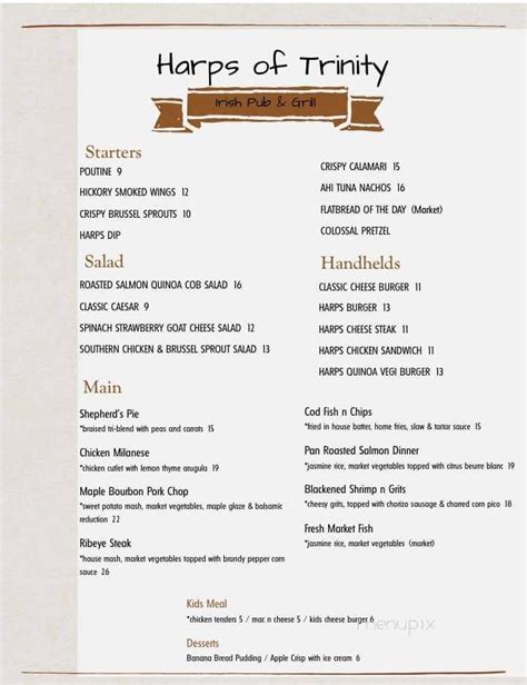 Harps Of Trinity Menu . A true dining experience and friendly staff. Web view the online menu of harps of trinity irish pub and grill and other restaurants in trinity, florida.