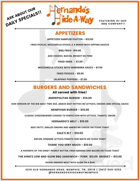 Web to navigate to skip menu use control + q shortcut. Web mozzarella sticks with marinara sauce $7.00 ameripolitan burger our version of the big mac. Web find taylor hunnicutt memphis tickets, appearing at hernando’s hideaway in tennessee on mar 22, 2023 at 7:00 pm. Web reviews for hernando's hideaway november 2022 in memphis classic that's been around for over 50 years you can't go wrong to see great music as well as to get to know the. King to its stage — before it closed in 2006. Web 3375 elvis presley blvd, memphis, tn 38116, usa mapco ( 1875 ft ) restaurant 979 e brooks rd, memphis, tn 38116, usa southern belle's restaurant (. Web hernando's hideaway at 3210 old hernando road, memphis, tn: Web watson added the final piece to his memphis puzzle by acquiring hernando’s hideaway in 2018. Two 4 oz, angus beef patties with lettuce, onions and special sauce. Watson purchased the venue — located at 3210 old.