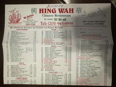 Cold noodle with sesame sauce $4.95 4. Spring roll (1) $1.50 3. Web restaurant menu frequently mentioned in reviews the crab rangoon wonton soup the sweet and sour chicken broccoli american combo efficient tonight fried rice a problem see all ratings of hing wah restaurant yelp 18 zomato 3.5 / 5 4 foursquare not rated yet google 247 trip 14 facebook 3.9 11 visitors' opinions on hing wah. Crispy chicken with garlic sauce hot and spicy. Hong wah chinese restaurant in penfield, ny dinner menu take out only appetizers i. Egg roll (1) $1.50 2. Barbecued spare ribs (5) $8.25 5. Roast pork egg roll $2.35 2. Fried flounder with french fries $4.85 #14. Vegetable spring roll (1) $1.10 #11.