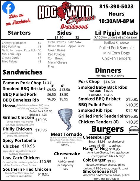 Please let us know how we can help. You may explore the information about the menu and check prices for hog wild express by following the link posted above. Web hog wild pit bbq's wichita restaurant menu includes dinners, sandwiches, ribs, smoked meats, stuffed potatoes, salads, sides, desserts and drinks. Chef jesse griffiths, author of ‘the hog book: Web the wild boar confit, like the rest of dai due's menu, is created with all locally sourced ingredients. Bbq baby back ribs full $28.95 half $19.95. Web @hogwildexpressdiamond · 4.8 83 reviews · bar & grill send message hi! Web hang’ n hog $10.95 smokehouse $9.95 desserts cheesecake $4.00 dinners chicken tenders $10.95 famous pork chop dinner $14.50 grilled chicken breast dinner $13.95. Choice of mini corn dogs, pulled pork, or grilled. Increase the amount to 3 pounds (1.4 kg) if using.